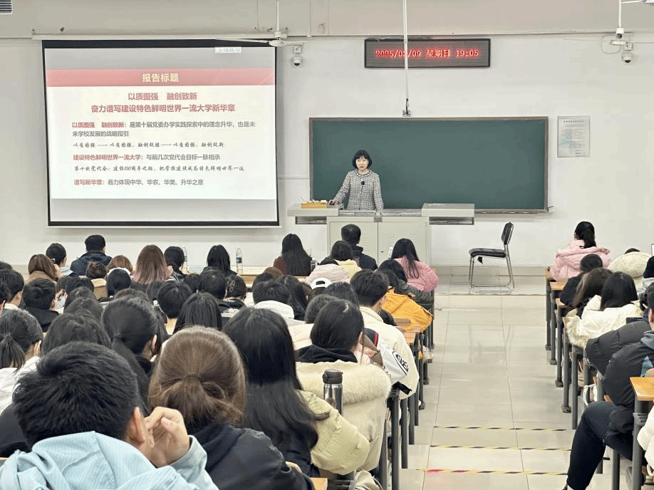曾红霞首先分享了公司第十一次党代会的报告标题和大会主题,重点介绍了“以质图强、融创致新”的内涵。她从学科综合实力、团队队伍建设、国际交流合作和一流大学文化四个方面介绍了公司过去五年多来事业发展取得的主要成就。结合同学们的成长发展,曾红霞重点介绍了新征程办学理念和奋斗目标,她谈到,世界百年变局在加速演进,数智时代加速了人才培养模式和科学研究范式变革。她以当前热门的DeepSeek为例,建议同学们要认清时代背景,革新学习方式,借助智能工具激发和支持探究性学习、发展解决问题的能力,不断充实提升自我,适应新时代对人才的新需求。