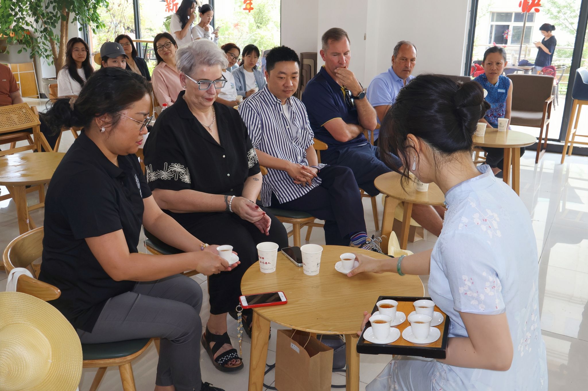 茶厂参观结束后,林肯大学教师代表团前往员工综合服务大楼103室,沉浸式体验中国茶艺之美。茶学20级硕士生曹雅婷以利川红茶为主题,演绎传统盖碗茶艺。温杯、投茶、注水、出汤……她以行云流水般的动作,将茶艺的精细美学展现得淋漓尽致。志愿者高天乐同步英文解说利川红茶的发酵工艺与文化内涵,并邀请师生品鉴茶汤。醇厚甘润的滋味与氤氲茶香中,中外师生共话茶道哲学,探讨茶文化在国际交流中的纽带作用。