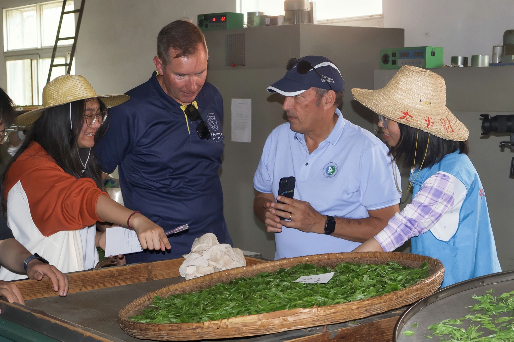 4月9日上午,活动聚焦中国茶文化的深度体验。正式采茶前,本次活动的志愿者讲解员,来自生态2401班张晨雨、庞华怡首先给参加活动的师生讲解了采茶的要领,介绍了茶树育种技术与不同茶类的采摘方法,随后,大家四散在茶田里,尽情享受着采茶的乐趣,师生们体验嫩芽采摘,感受“一芽两叶”的采茶标准。茶叶采摘结束后,大家来到了绿茶加工车间,观摩绿茶从鲜叶到成品的完整加工流程。志愿者张晨雨以绿茶制作为例,分步骤解析摊青、杀青、揉捻、干燥四大工艺:“摊青需静置鲜叶4至5小时以促水分蒸发;杀青通过高温锁住清香;揉捻塑形提香;干燥则确保茶叶品质稳定。”林肯大学Tracy Filipo触摸杀青机处理后的茶叶,对比不同工艺对风味的影响,师生们就茶树品种改良、制茶机械化与传统工艺平衡等话题与茶学专业同学展开热烈讨论。