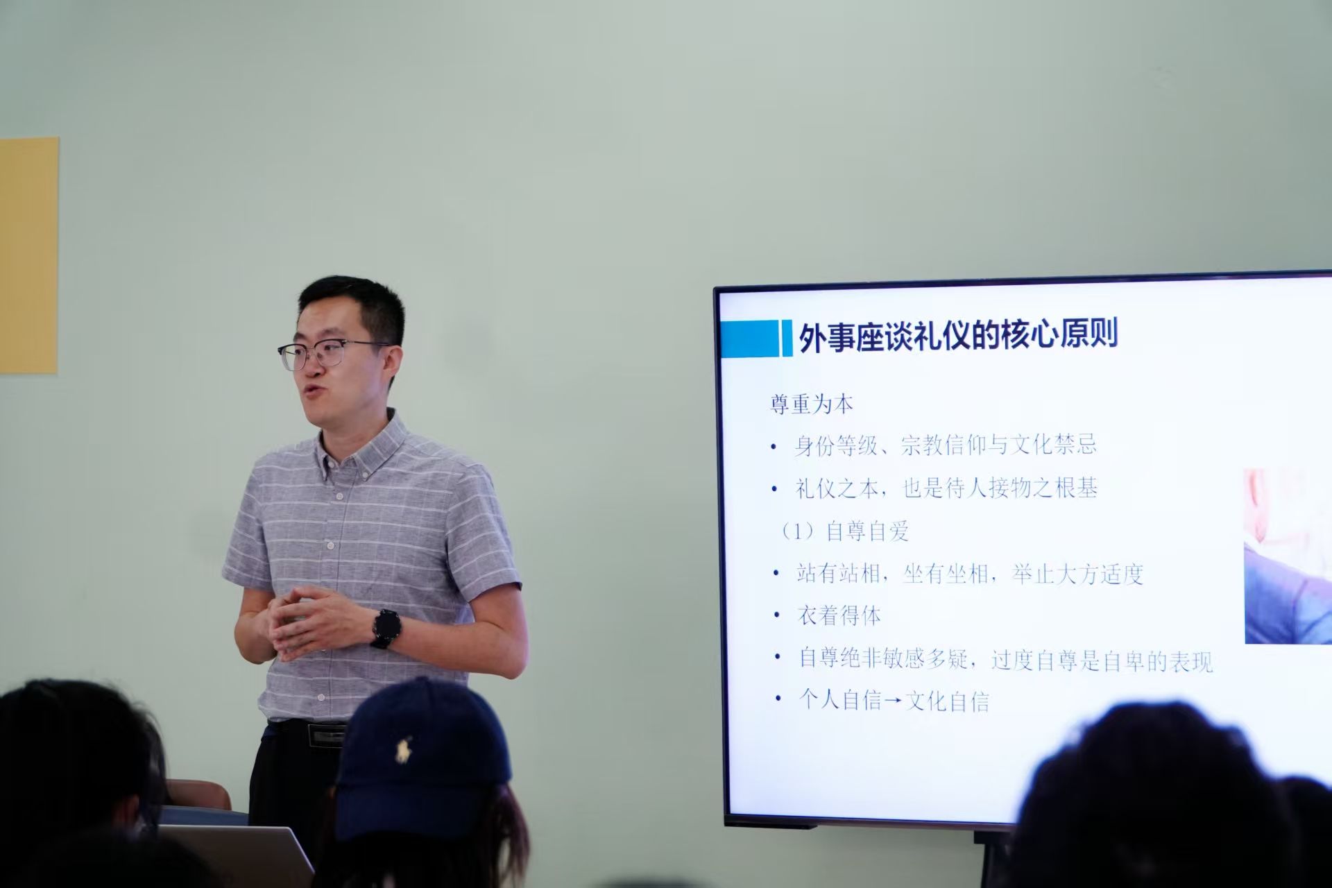 在外事座谈礼仪的讲解部分,周尧详细阐述了核心原则,着装、行为规范、文化差异应对以及突发情况处理策略。“在正式外事座谈中,着装要得体,遵循场合要求,展现出专业与尊重;行为上,要保持礼貌、专注,注意肢体语言,避免不当举动。”他生动展示了在不同类型活动中的礼仪规范,强调了熟悉适应不同文化的重要性,鼓励同学们在交流中保持开放包容心态。针对外事座谈前的准备,他还特别指出,参与者需要了解相关人员的背景信息和可能涉及到的对话主题,以便在活动中自信应对。