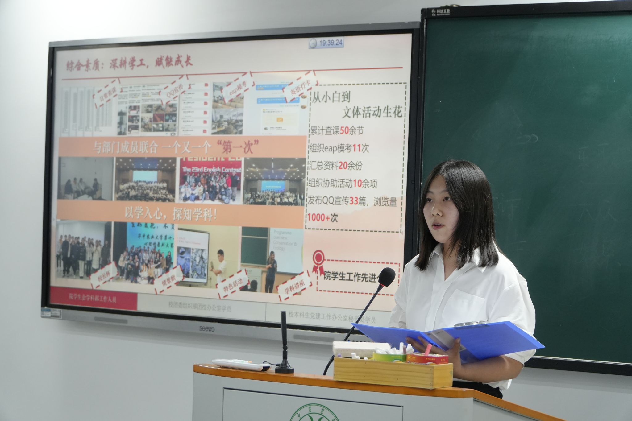生态2402班李耔默从德育发展、学业筑基、社会实践、综合发展四个方面,回顾了大一学年的成长历程。作为学科部成员,她与部门同学积极落实日常查课、EAP模考、英语打卡等工作,将“以学入心,探知学科”作为学习与员工工作的目标与着力点。