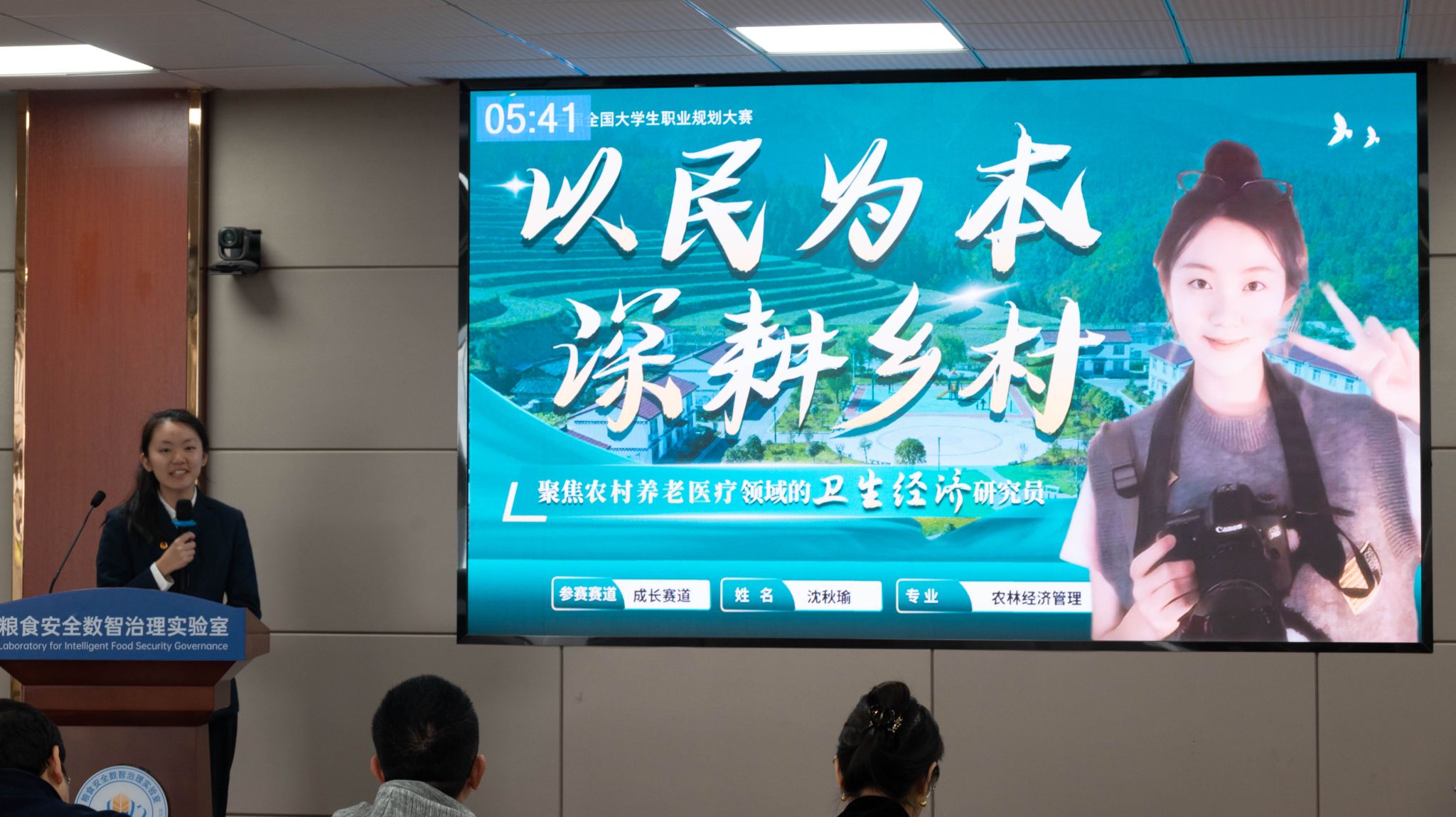 沈秋瑜在比赛中分享农村医疗研究成果(俞虹静、鹿韩旭 摄)