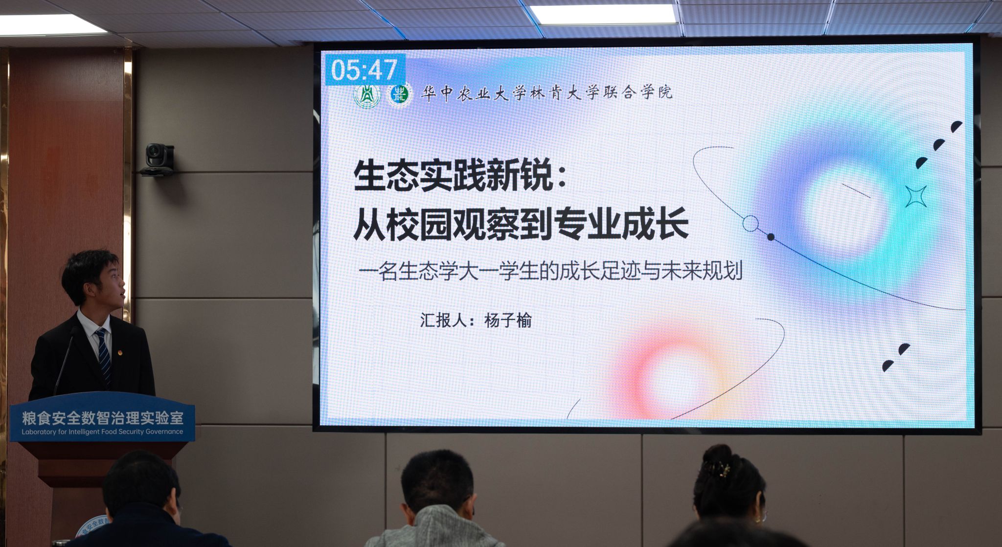 生态2501班杨子榆以“生态实践助手”为阶段性定位,展示了在校园生态观察、水培装置设计与省级科创项目中的实践成果,体现了从理论到落地的探索路径与创新精神。