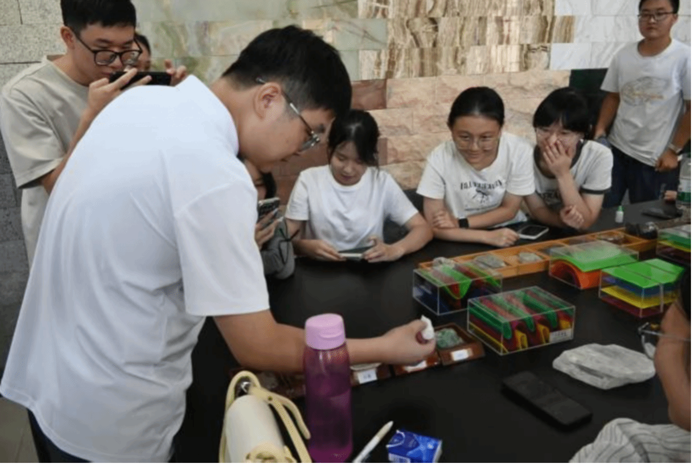 易层老师从常见岩石讲起,逐步引领同学们迈入地质学领域。实验台上摆放着各式各样的矿石,他逐一介绍:用力敲击方解石,能看到其独特的方解结构;石英晶莹剔透,常与其他矿物共生,在特定条件下可能形成水晶;石膏则颇具特色,像玫瑰般在沙漠地区绽放。他还以华农校门口的灵璧石为例,讲解这种产于安徽灵璧县的碳酸盐岩 —— 作为石灰岩的变质岩,其平坦表面需经千万年冲刷才得以形成,让同学们真切感受到自然造物的神奇与不易。