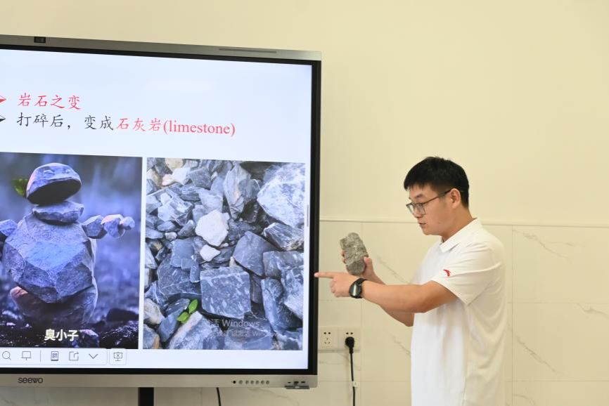 活动伊始,易层老师以 2025 年爆火的中国动画电影《哪吒之魔童闹海》中深受观众喜爱的角色石矶娘娘作为导入,“有哪位同学知道石矶娘娘是由哪一种岩石组成的吗?” 同学们积极讨论、踊跃举手,现场氛围瞬间活跃。易层老师借此转入对岩石类型的讲解。