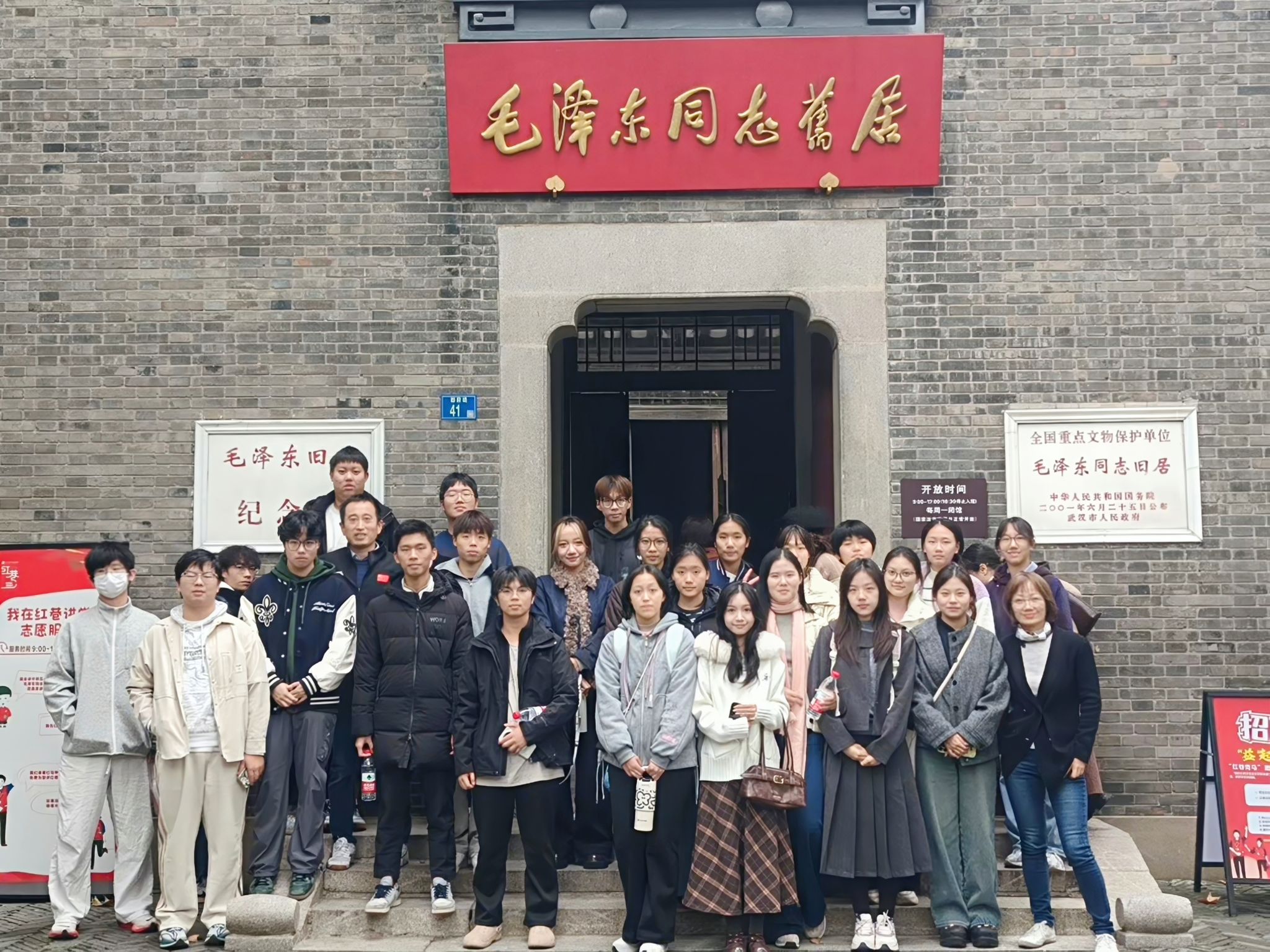 同学们团建旅程的第一站来到毛泽东故居。这座古朴的晚清民居,见证了1927年毛泽东在武汉开展革命工作的重要岁月。青砖灰瓦,木门石阶,处处透露着历史的厚重感。同学们认真参观每一个展室,从简朴的起居室到充满书香的书房,从珍贵的历史照片到泛黄的手稿文献,都在无声地诉说着那段峥嵘岁月。