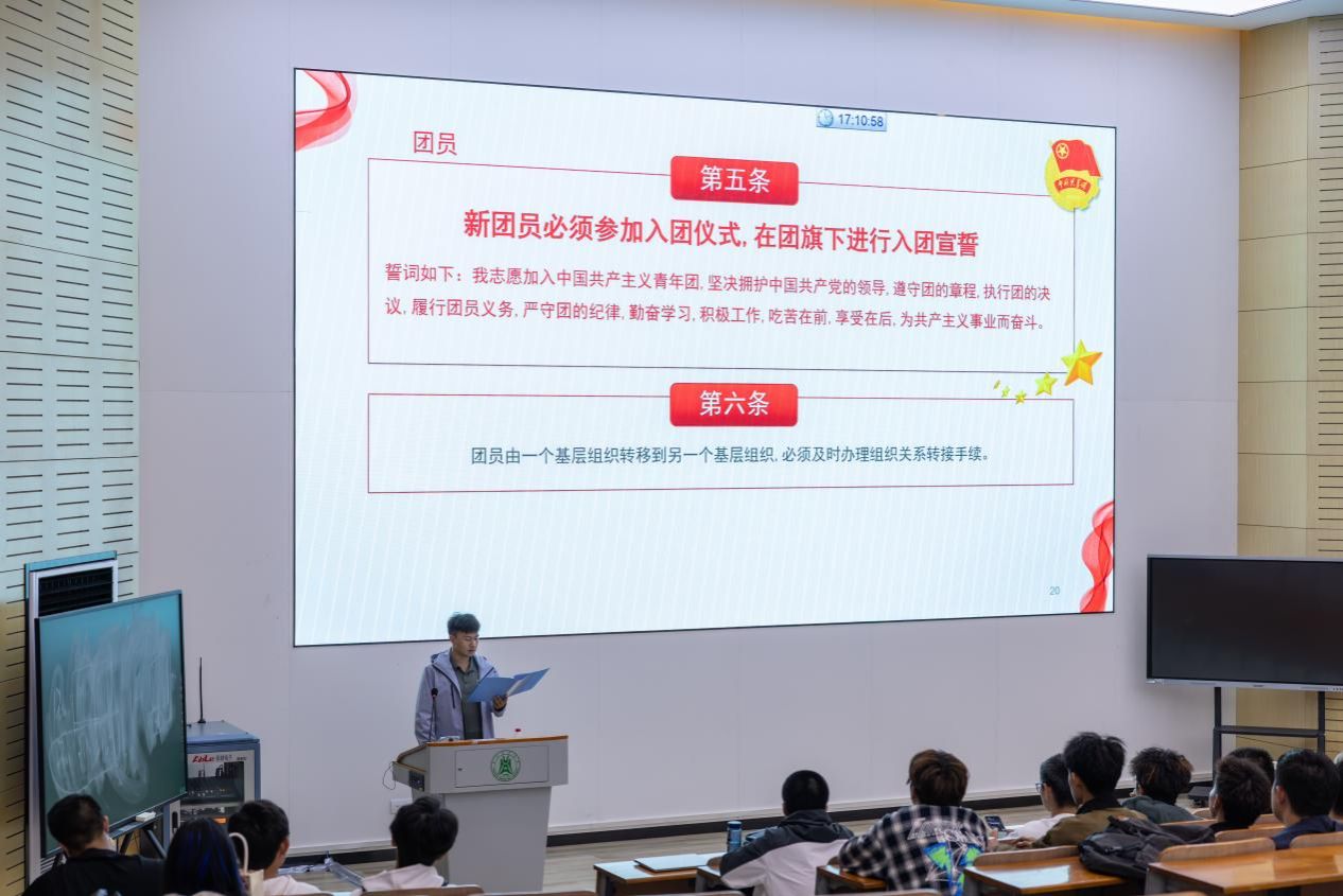 在团务实操教学环节,孟令炜老师详细说明团组织关系转接的具体流程、团费缴纳的标准金额及 “青年大学习” 的参与要求;针对入团流程,他逐一明确入团积极分子需满足的各项条件,确保入团发展流程规范透明,让新生同学清晰了解团务工作的具体要求。