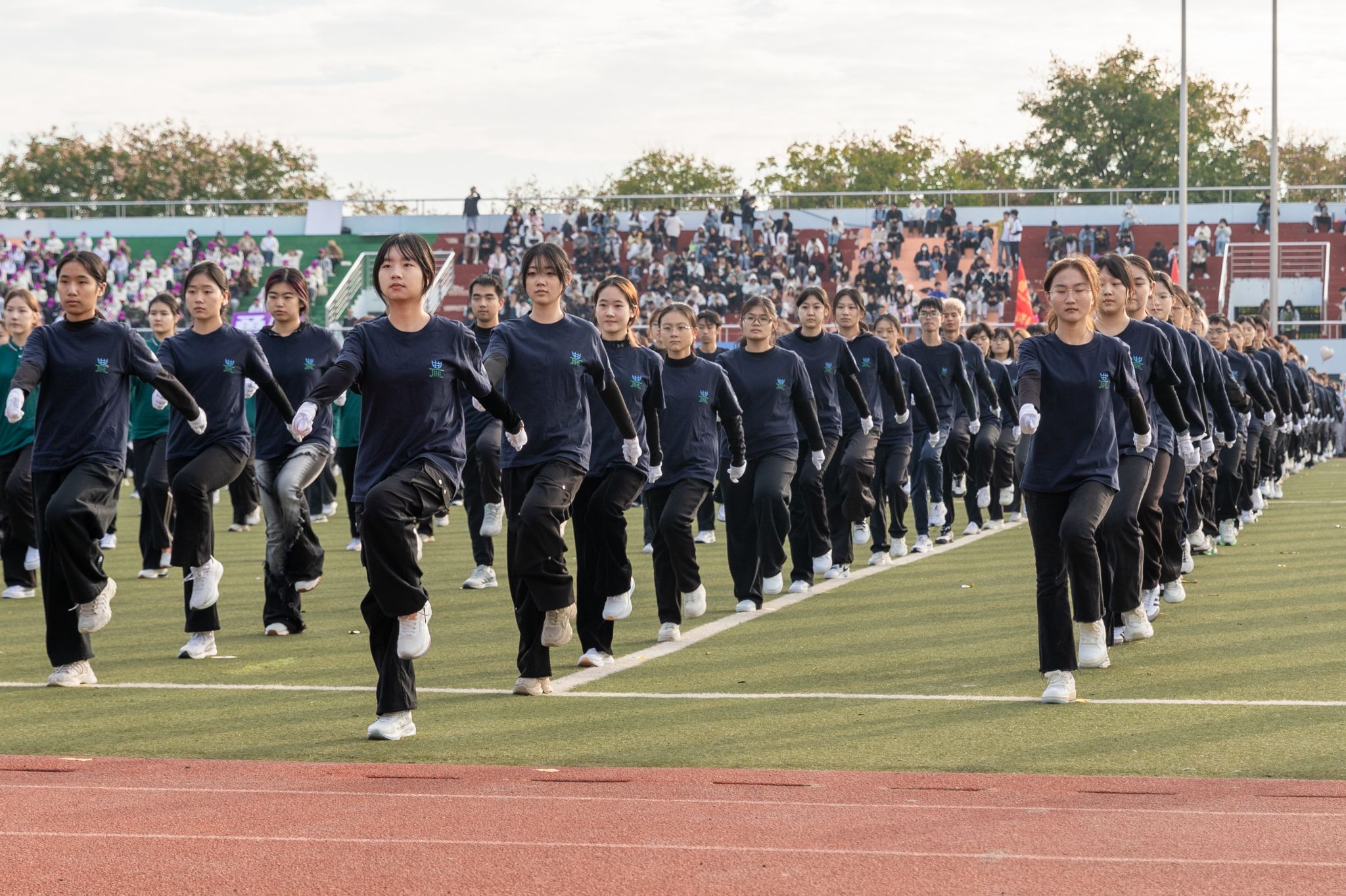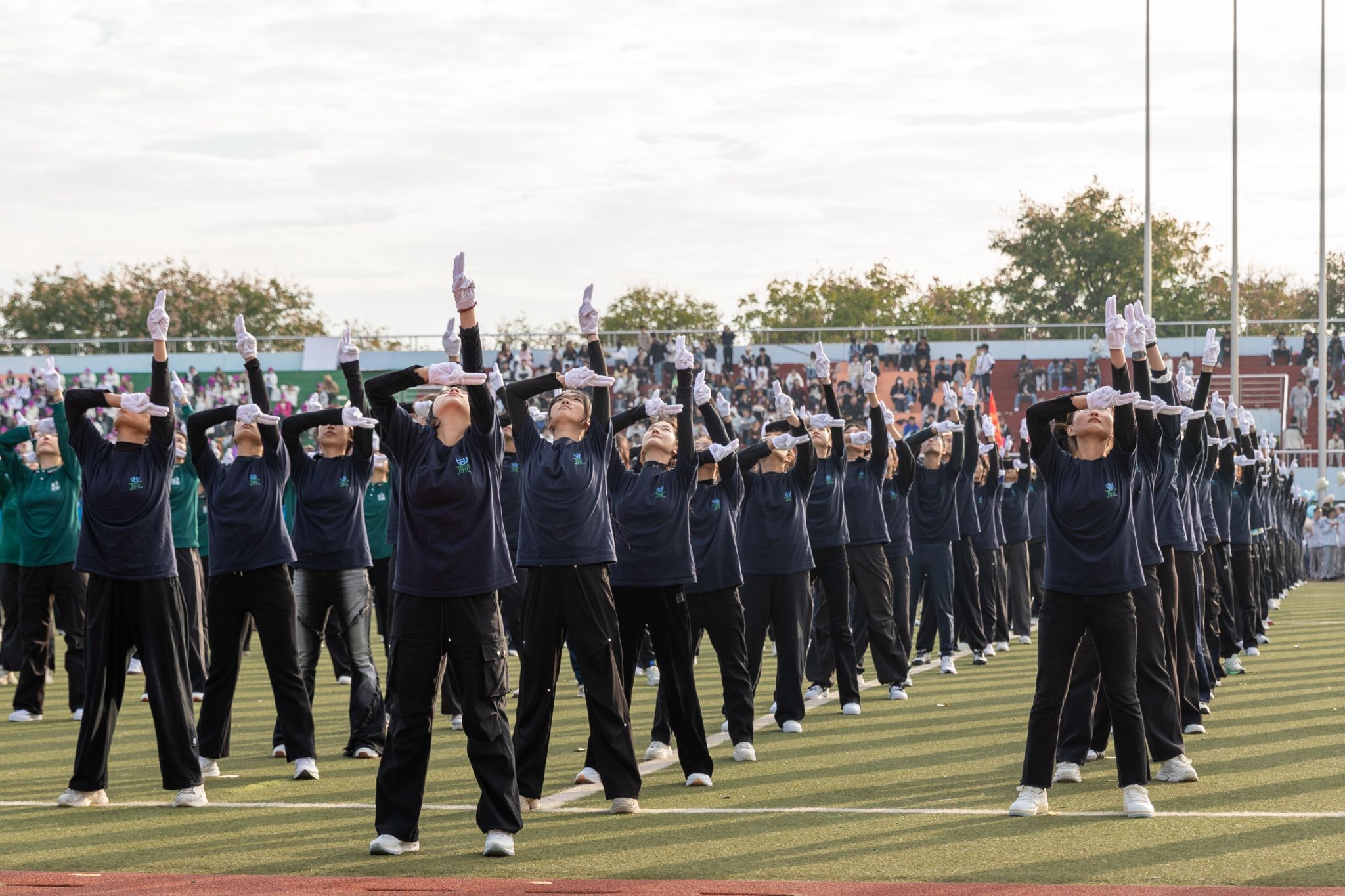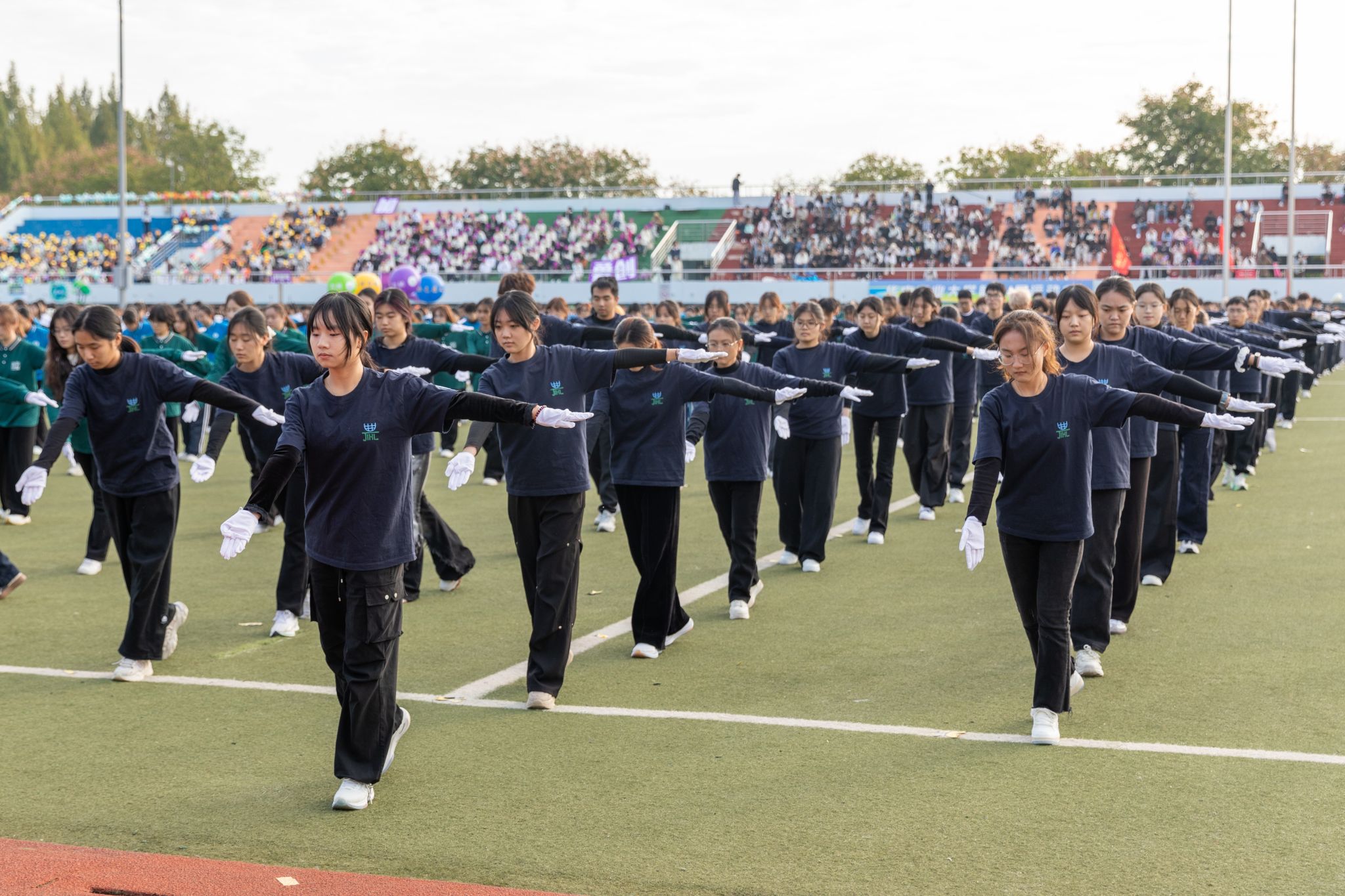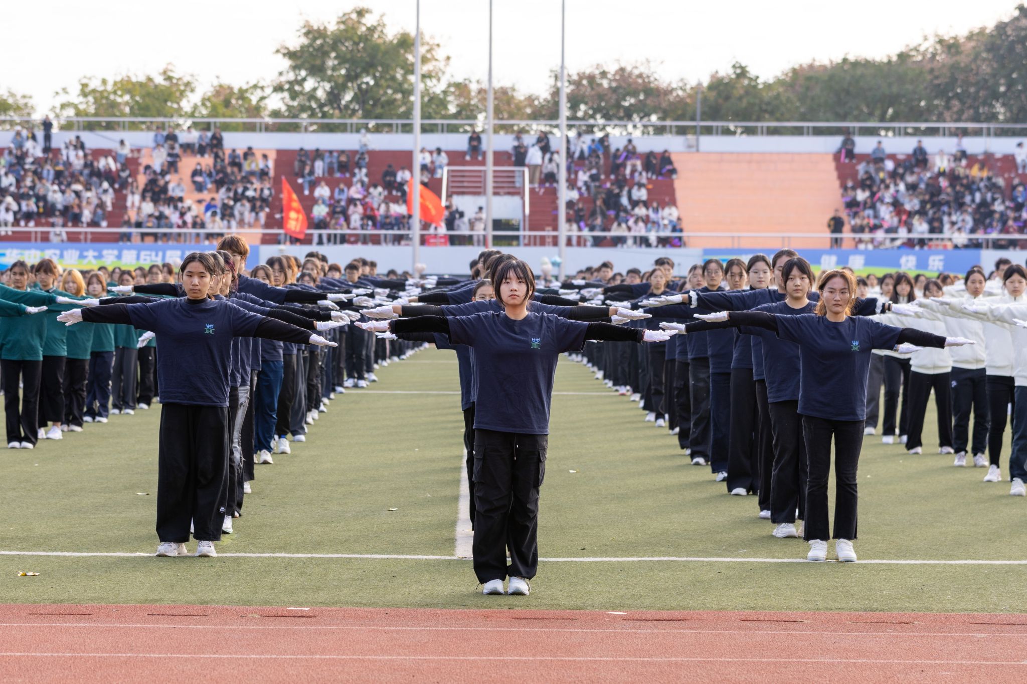 广播操展演环节,伟德国际1946 121 名学子身着统一黑色院服亮相全校师生。经过两周的密集训练,同学们动作整齐划一 —— 抬手时臂线笔直如弦,踏步时声浪铿锵共振。摆臂转体间,彰显出华农林肯学子同心同频的默契;昂扬的姿态里,尽显公司兼容并蓄的活力。