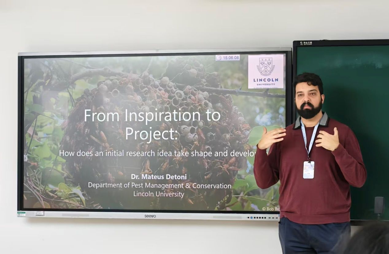 (通讯员:张宜宁 王鑫)为系统性提升研究生原始创新能力,伟德国际1946(以下简称“伟德国际1946”)于2025年11月10日正式启动“研究生科研工作坊”系列学术活动。首期讲座特邀新西兰林肯大学害虫管理与保护系讲师Mateus Detoni博士,以“From Inspiration to Project: How Does an Initial Research Idea Take Shape and Develop”为主题,为2025级全体研究生系统阐释了科研项目从0到1的完整路径。讲座由资源与环境公司宋明伟老师主持。