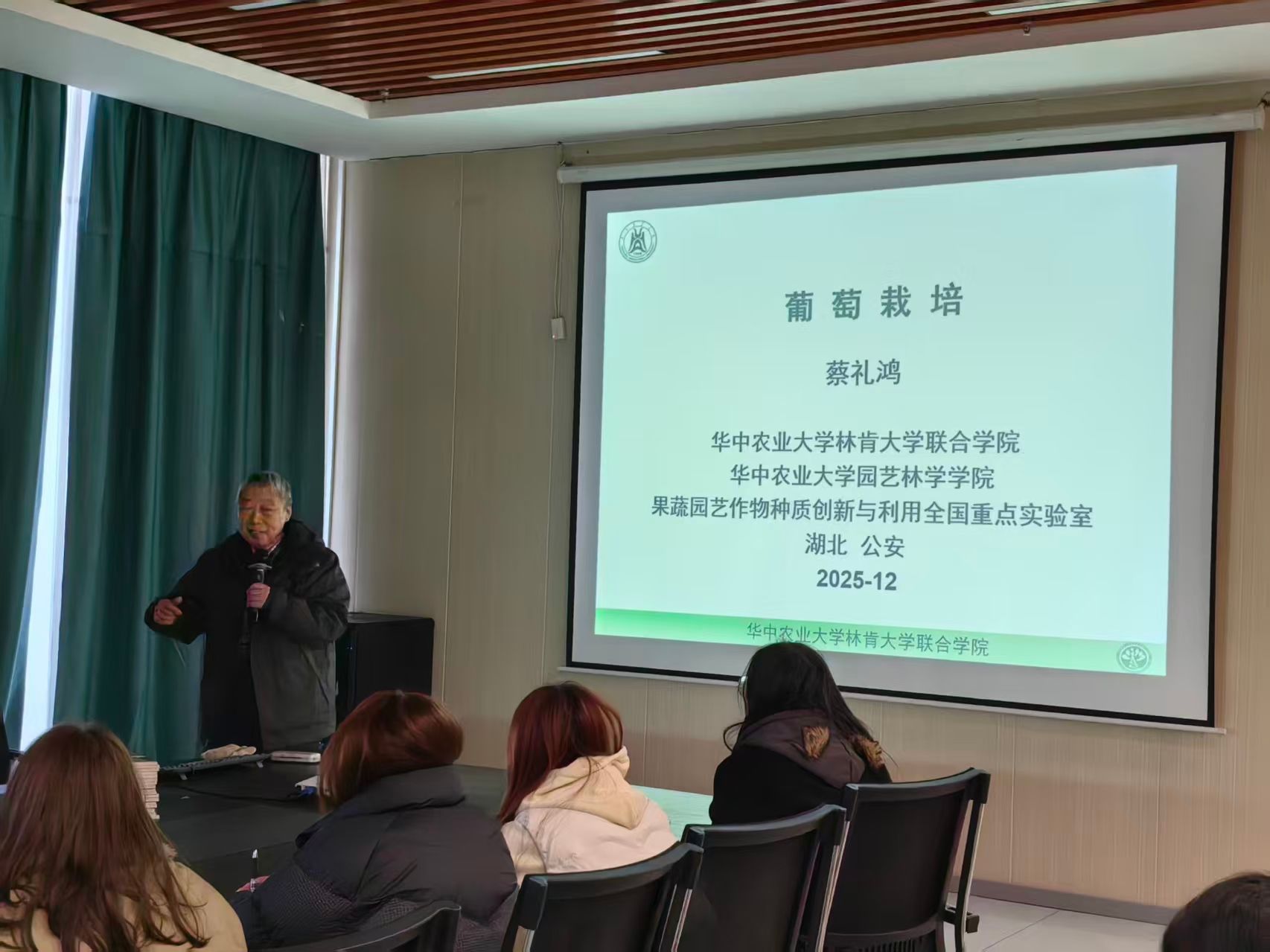 实习之旅始于深刻的认知启发。抵达当日,师生们首先前往荆州市金秋农业科技园参观学习。在公司创始人刘军与蔡礼鸿教授的生动讲解下,同学们深入了解了企业的架构、发展历程及其践行“乡村振兴”的深厚情怀与务实精神,为后续实习奠定了坚实的认知与思想基础。蔡礼鸿教授详实的“葡萄栽培”专题讲座,系统梳理了葡萄的起源历史、品种分类、生物学特性及关键栽培技术,为同学们构建起清晰的理论知识框架,筑牢了实践操作的理论根基。