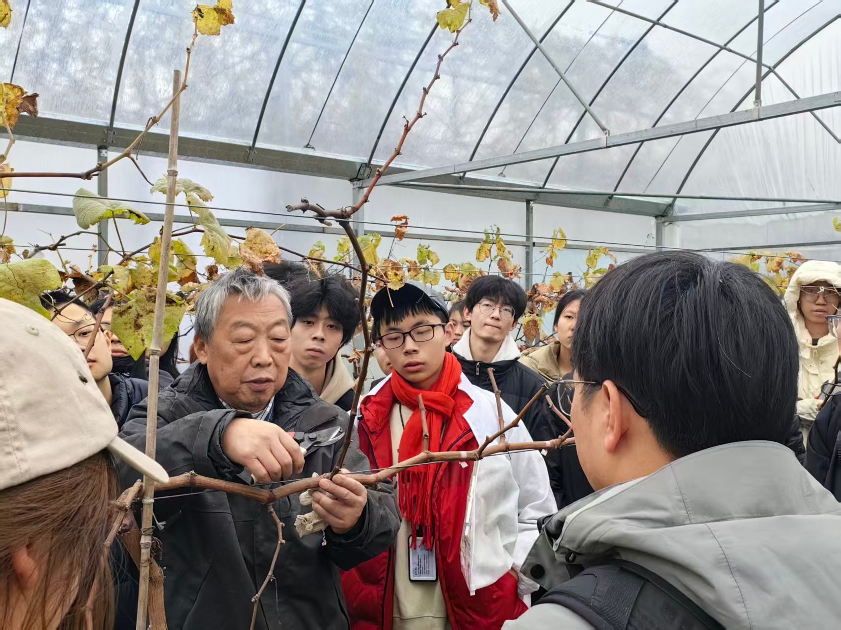 12月21日起,实习进入核心的实践操作阶段。师生们分为两组,分别深入企业园区与当地农户果园,开展葡萄冬季剪枝实操。在蔡礼鸿教授与经验丰富的农业技术员手把手的指导下,同学们从枝条辨认、修剪手法,到留枝密度与树形调控,边操作边学习,反复练习。尽管初涉实操略显生疏,但严谨的态度与团队协作精神助力同学们高效完成了首日任务。实习中,同学们还通过葡萄与桃树冬季修剪的对比教学,学习了藤本与乔木果树在生长习性与修剪思路上的差异。